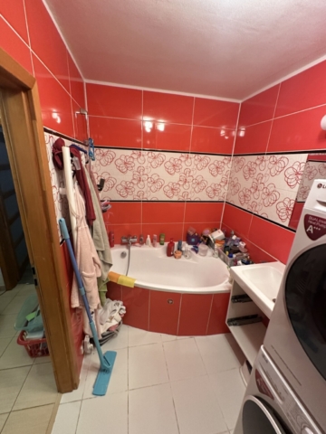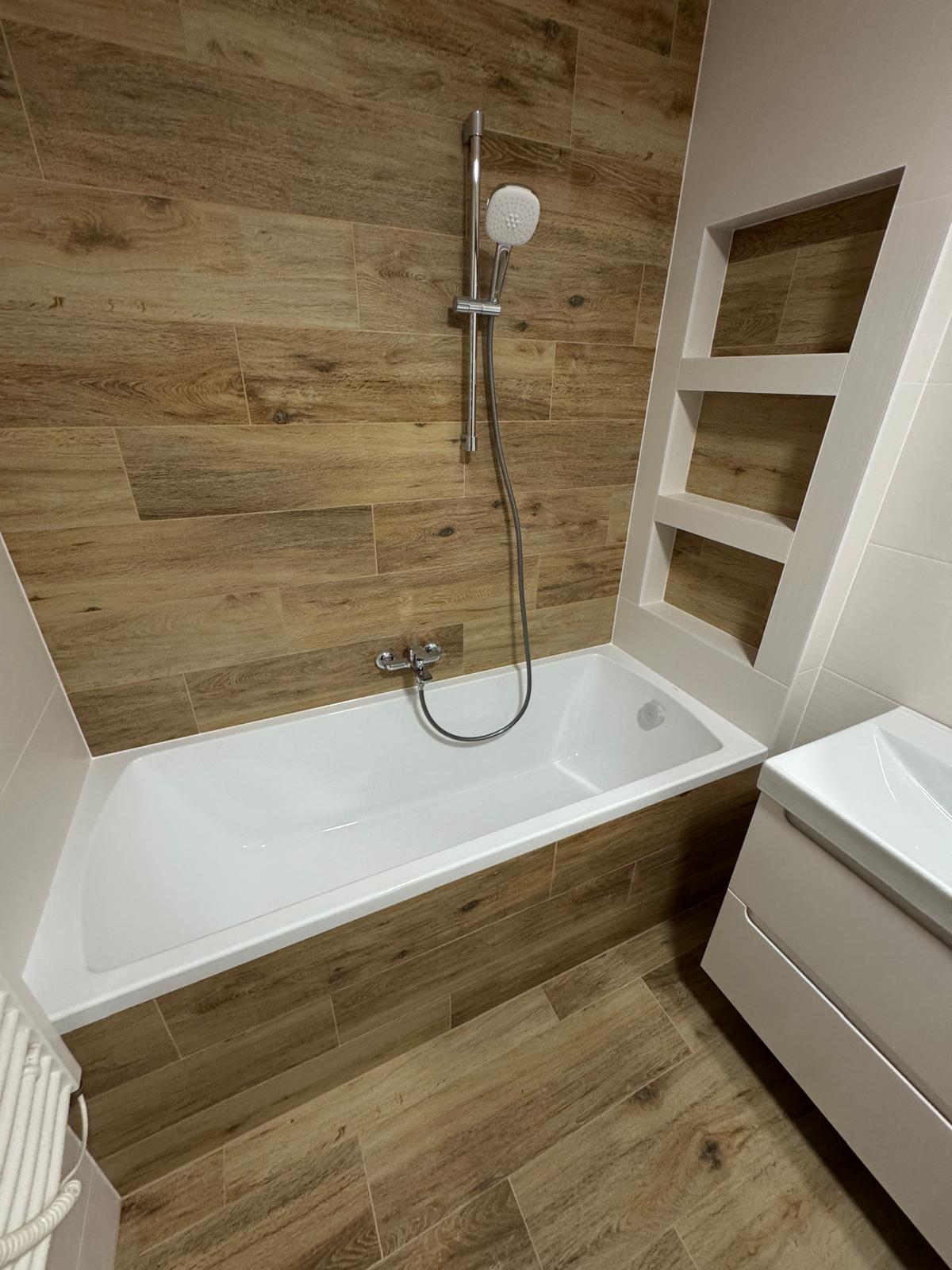 Původní rohová vana byla nahrazena klasickou rovnou vanou, která umožnila efektivnější využití prostoru a jednodušší uspořádání celé koupelny.