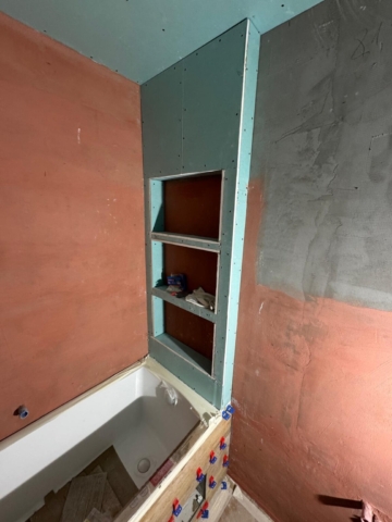U vany byla vytvořena vestavěná třípatrová nika obložená dlažbou, která slouží jako praktický úložný prostor pro kosmetiku a koupelnové doplňky.