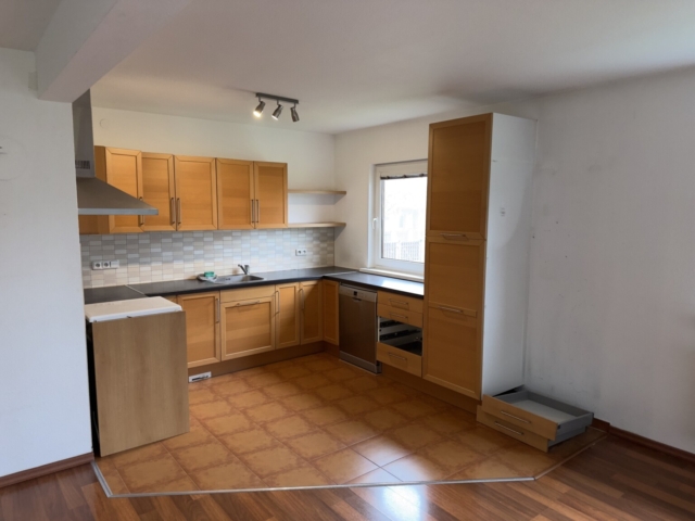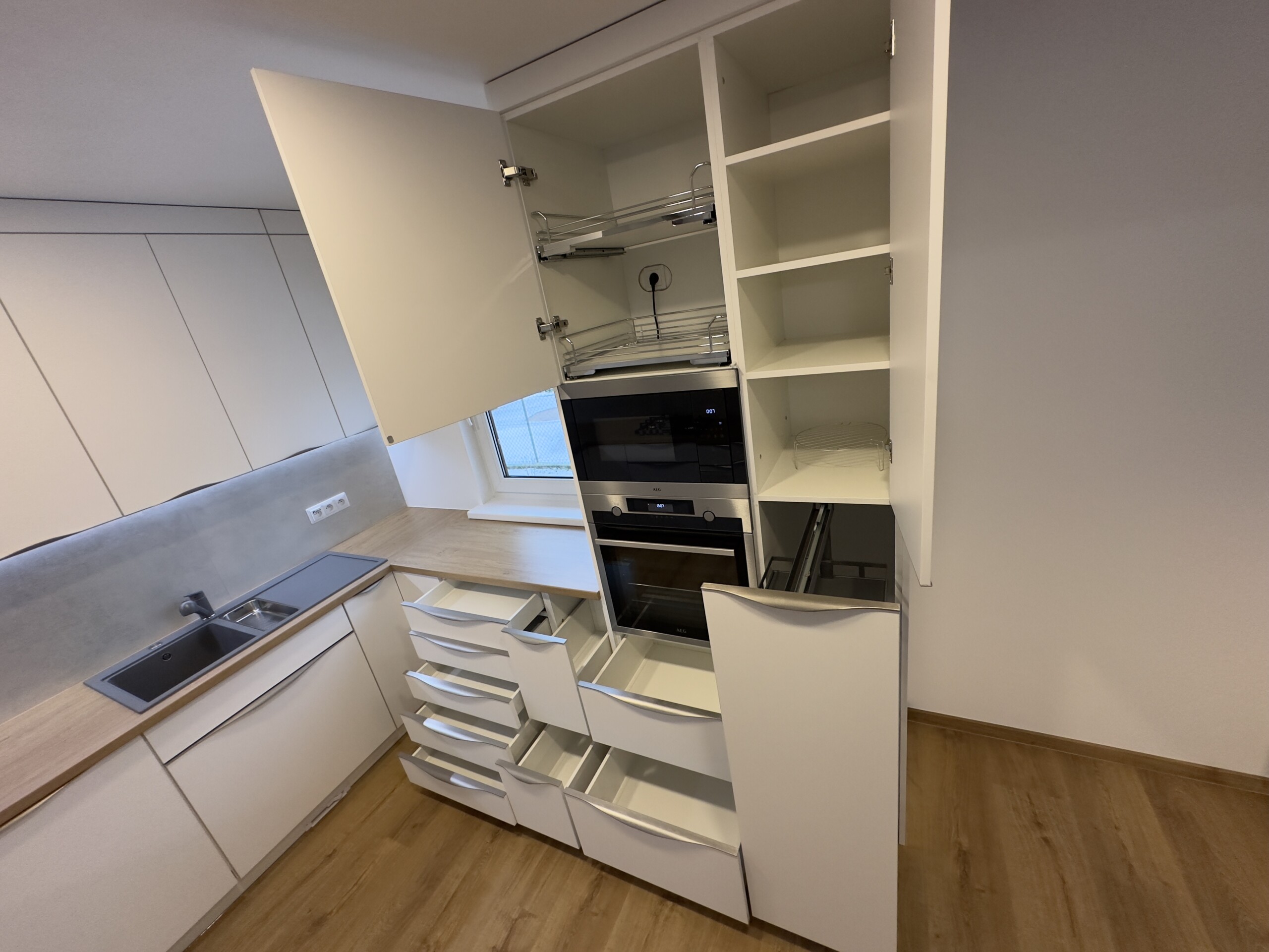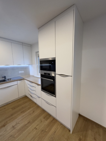 Součástí realizace byla kompletní dodávka kuchyně na míru – od návrhu až po finální montáž. Design kuchyně kombinuje bílý lesk a dekor dřeva, který navazuje na vinylovou podlahu v odstínu dubu.