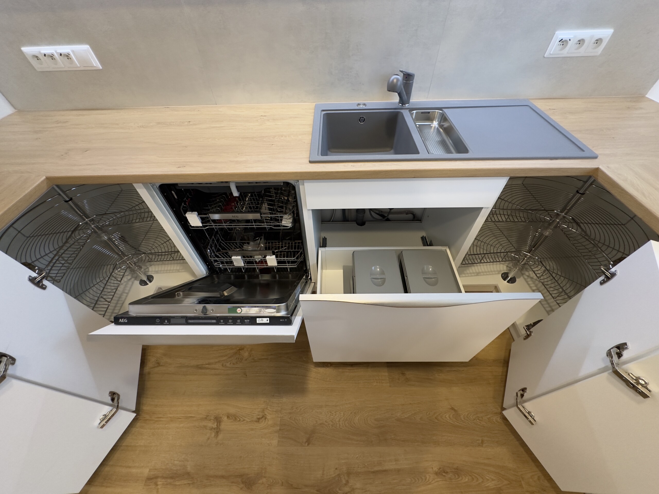 • vestavěné nádoby na tříděný odpad v zásuvce pod dřezem