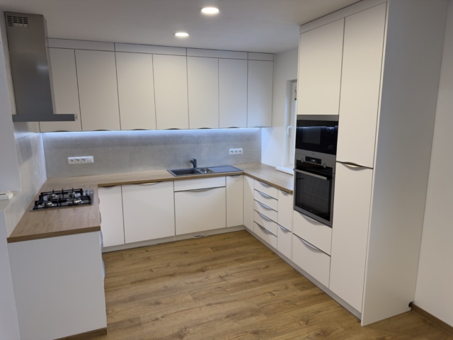 Součástí realizace byla nejen samotná kuchyň na míru, ale i kompletní stavební a instalační práce, které zajistily dlouhodobou funkčnost a komfort bydlení.