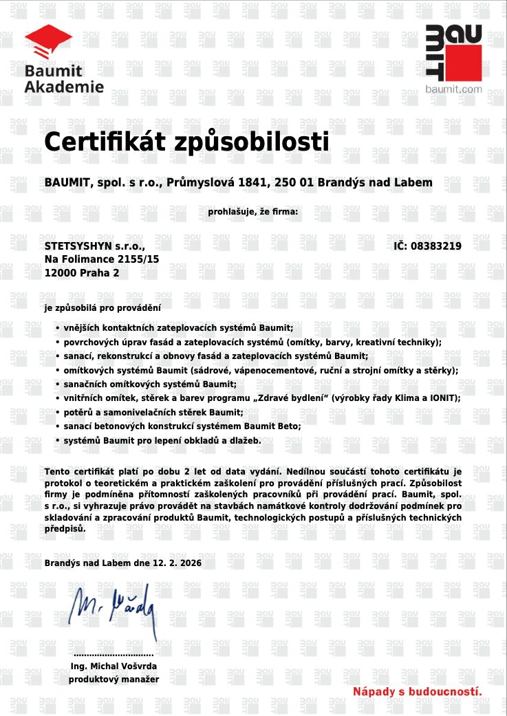 Ve společnosti STETSYSHYN s.r.o. se odbornosti věnujeme s maximální péčí. Jsme hrdí, že jsme získali Certifikát způsobilosti od Baumit Akademie, který potvrzuje naši kvalifikaci pro široké spektrum stavebních a fasádních prací, od zateplení až po speciální sanace.