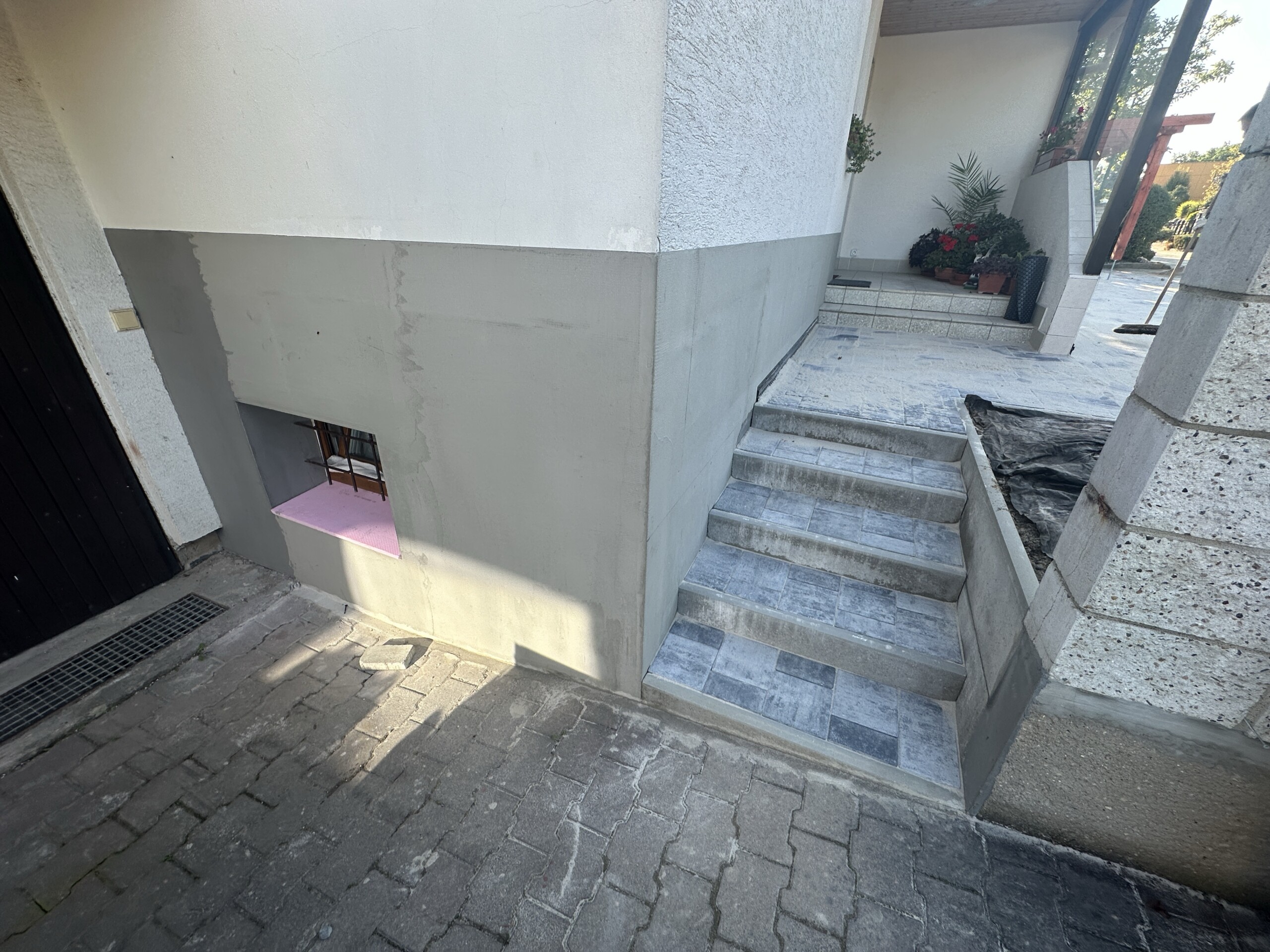 Důležitou částí realizace byla oprava fasády v oblasti soklu domu. Po očištění a sanaci poškozených částí jsme provedli novou úpravu povrchu a instalovali nopovou fólii kolem soklu domu.