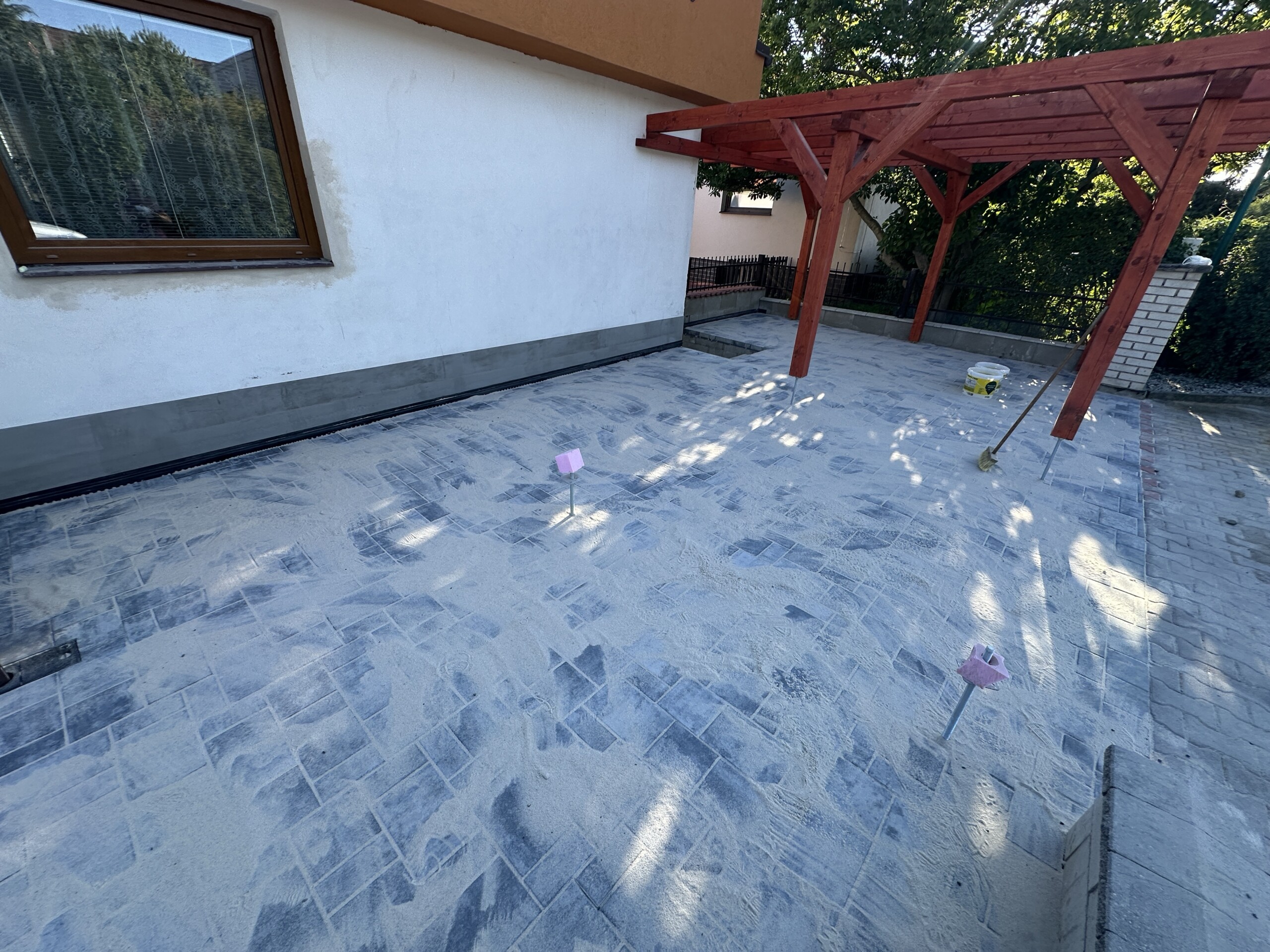 Tato realizace je ukázkou komplexního řešení venkovních ploch – od demontáže původních konstrukcí až po finální pokládku kvalitní zámkové dlažby Kombi Marmo.