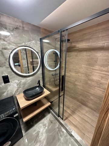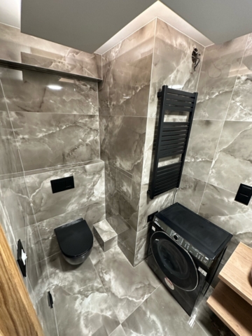 V rámci rekonstrukce byla provedena i instalace veškerého vybavení včetně pračky a koupelnového nábytku. Důraz byl kladen na precizní provedení detailů a sladění všech prvků do jednotného designu.