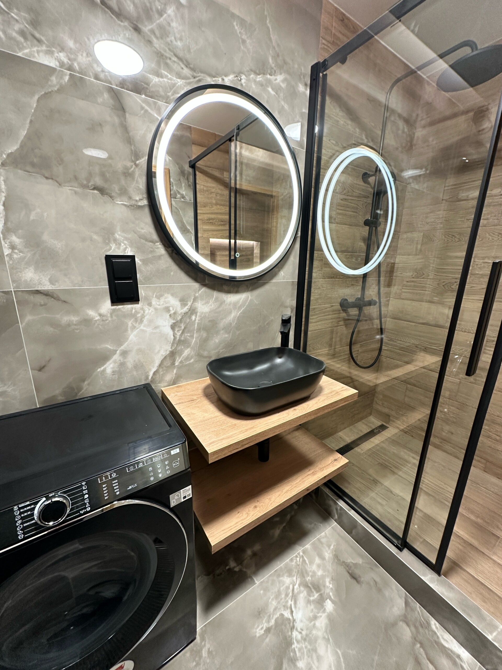 Celkový vzhled podtrhuje designové kruhové zrcadlo s osvětlením v černém provedení, které se stalo výrazným vizuálním prvkem koupelny.