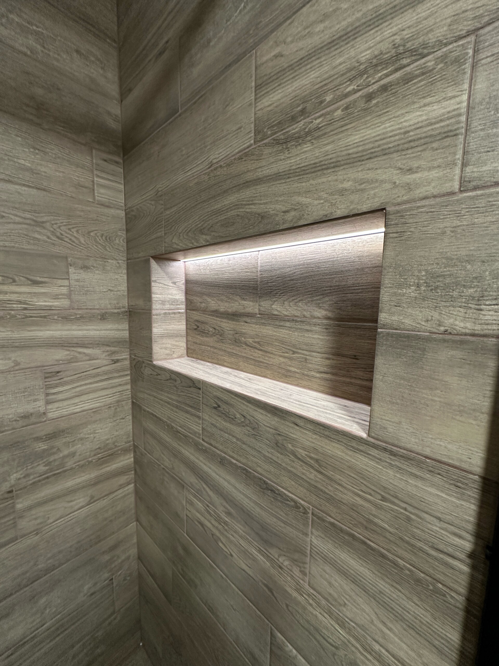 Dominantou nové koupelny je prostorný walk-in sprchový kout. Jeho součástí je zapuštěná nika s podsvětlením, která plní nejen praktickou funkci, ale zároveň vytváří výrazný estetický prvek.